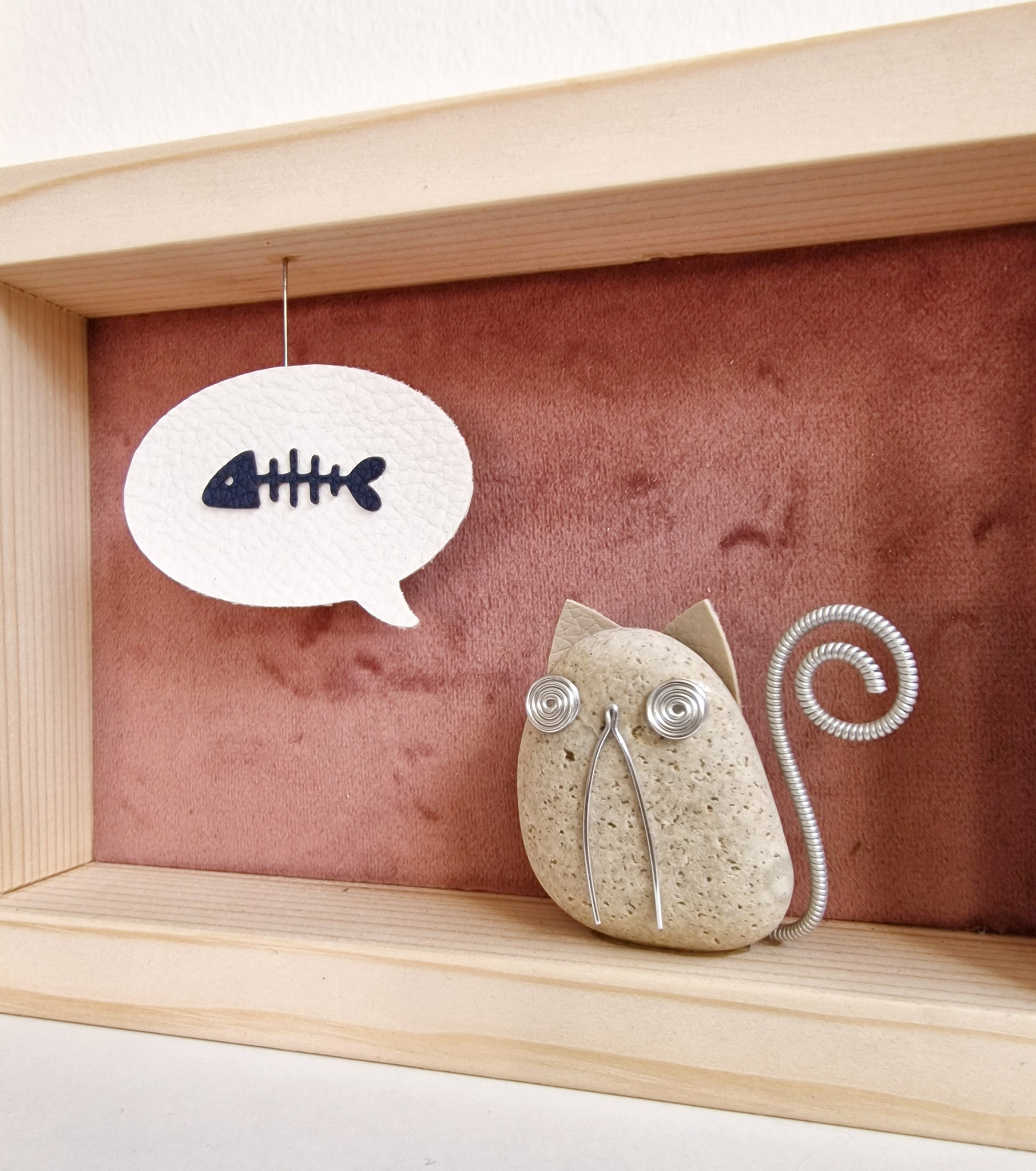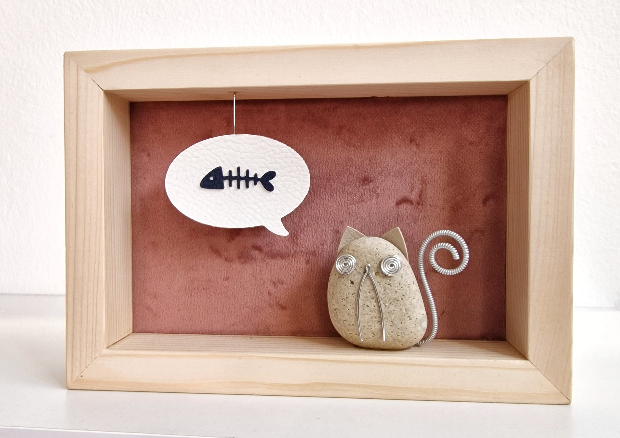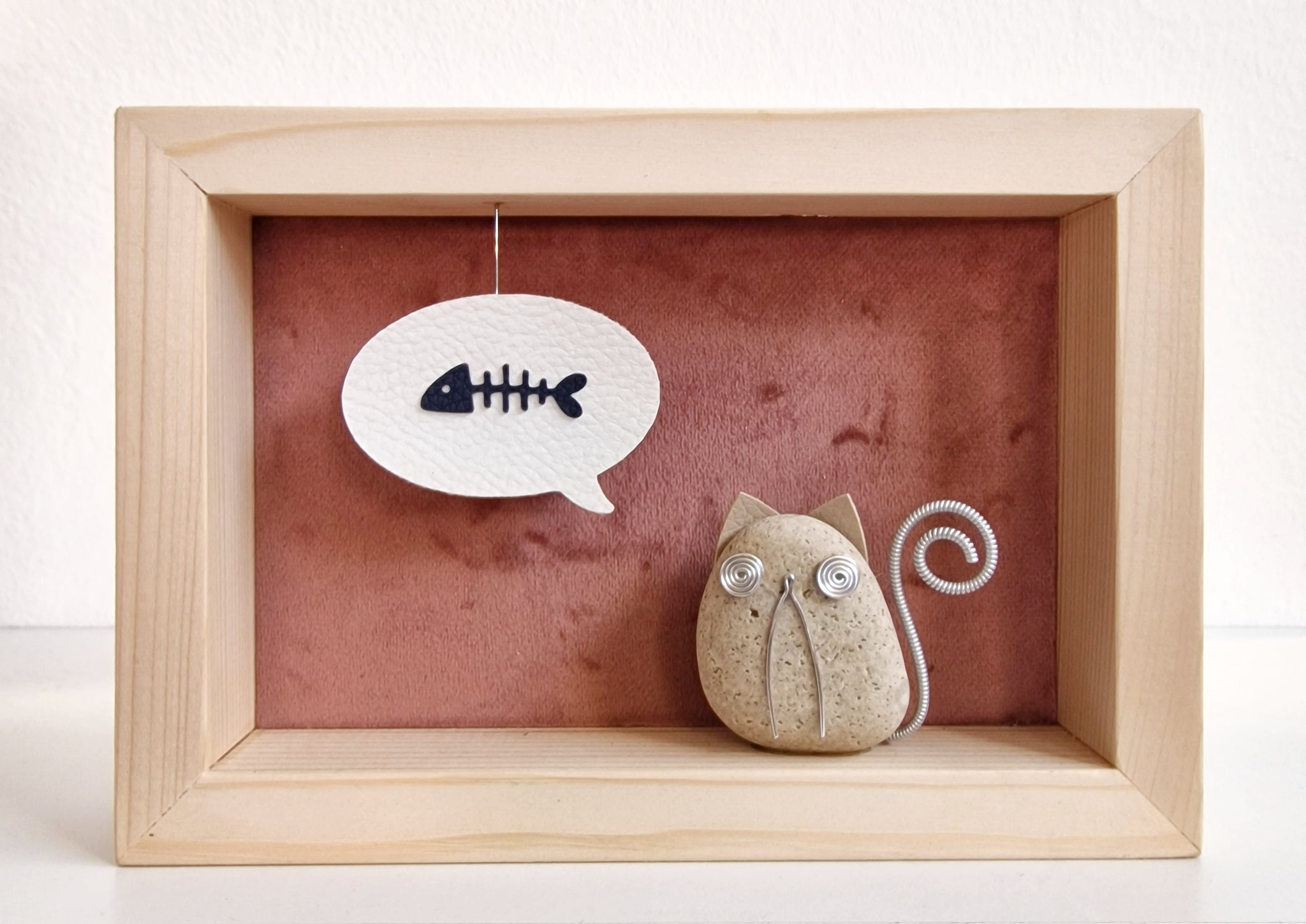 Quadro raffigurante un gattino e nuvoletta con lisca di pesce. Rappresenta il pensiero del gatto e ciò che i nostri amici pelosi ci comunicano. In una lingua tutta loro, ma comprensibile attraverso i loro occhi!