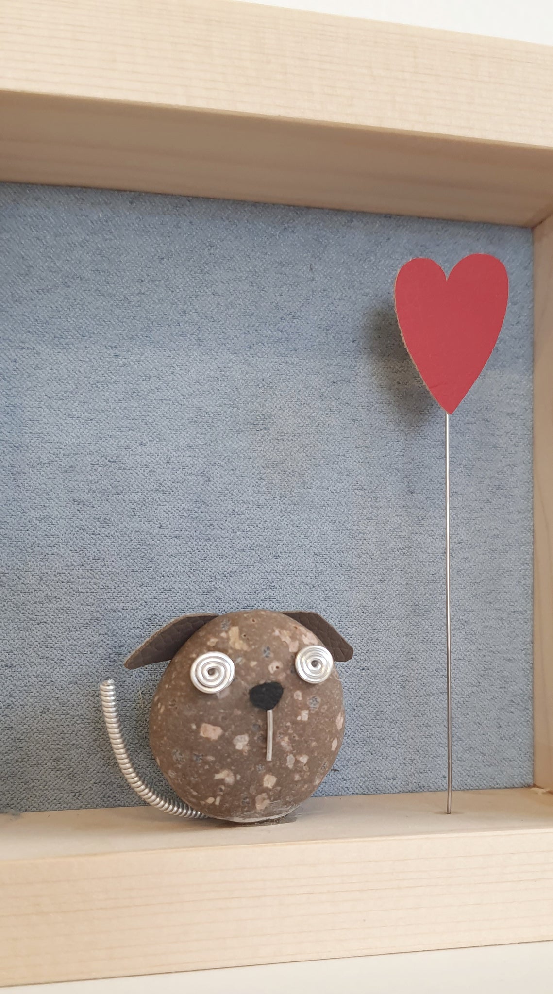 Il cagnolino è realizzato in pietra, filo di alluminio ed ecopelle.