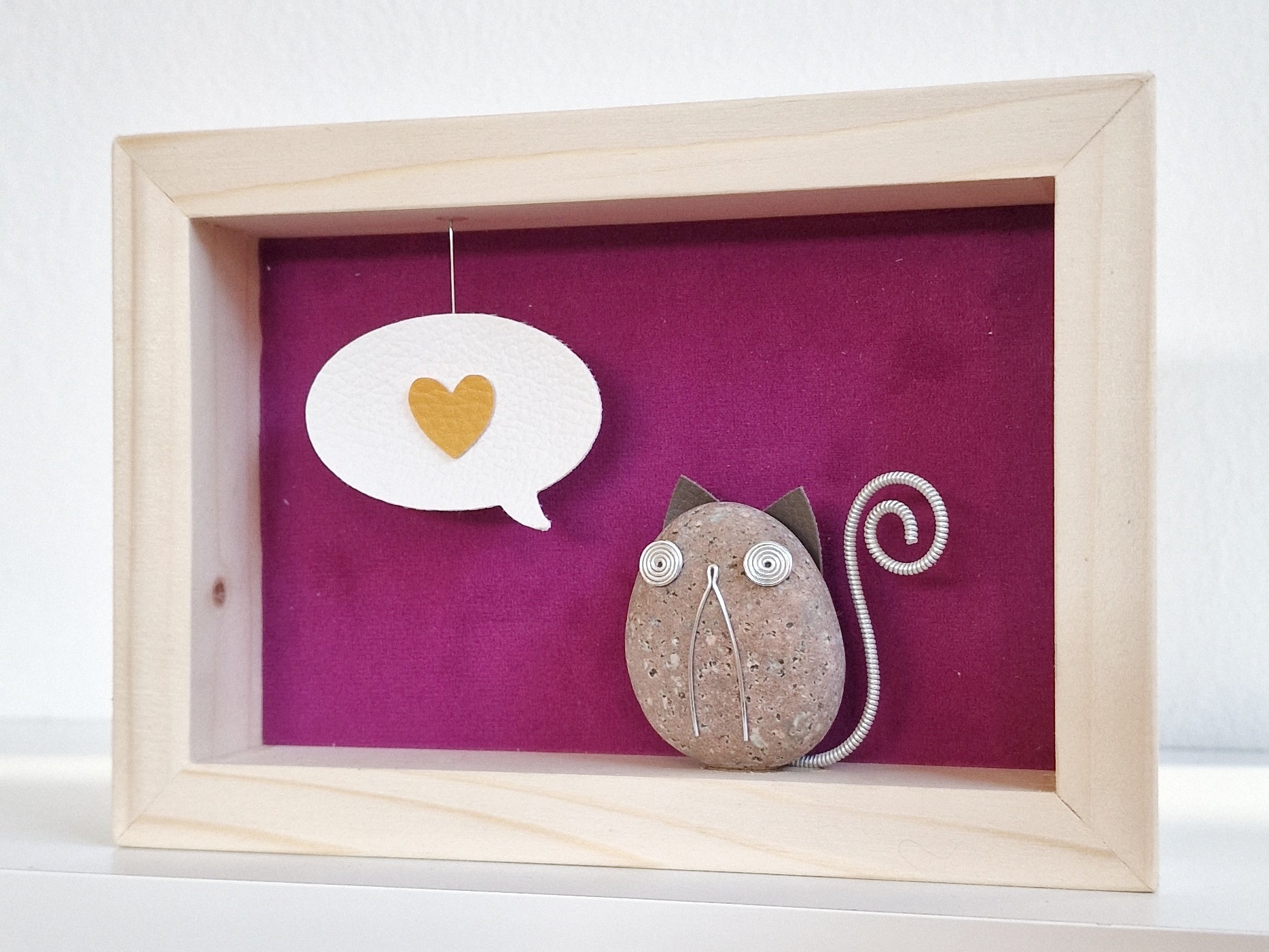 La nuvoletta e il cuore sono realizzati in ecopelle. È sospesa attraverso filo metallico incastonato nella cornice in modo da realizzare l'effetto tridimensionale.