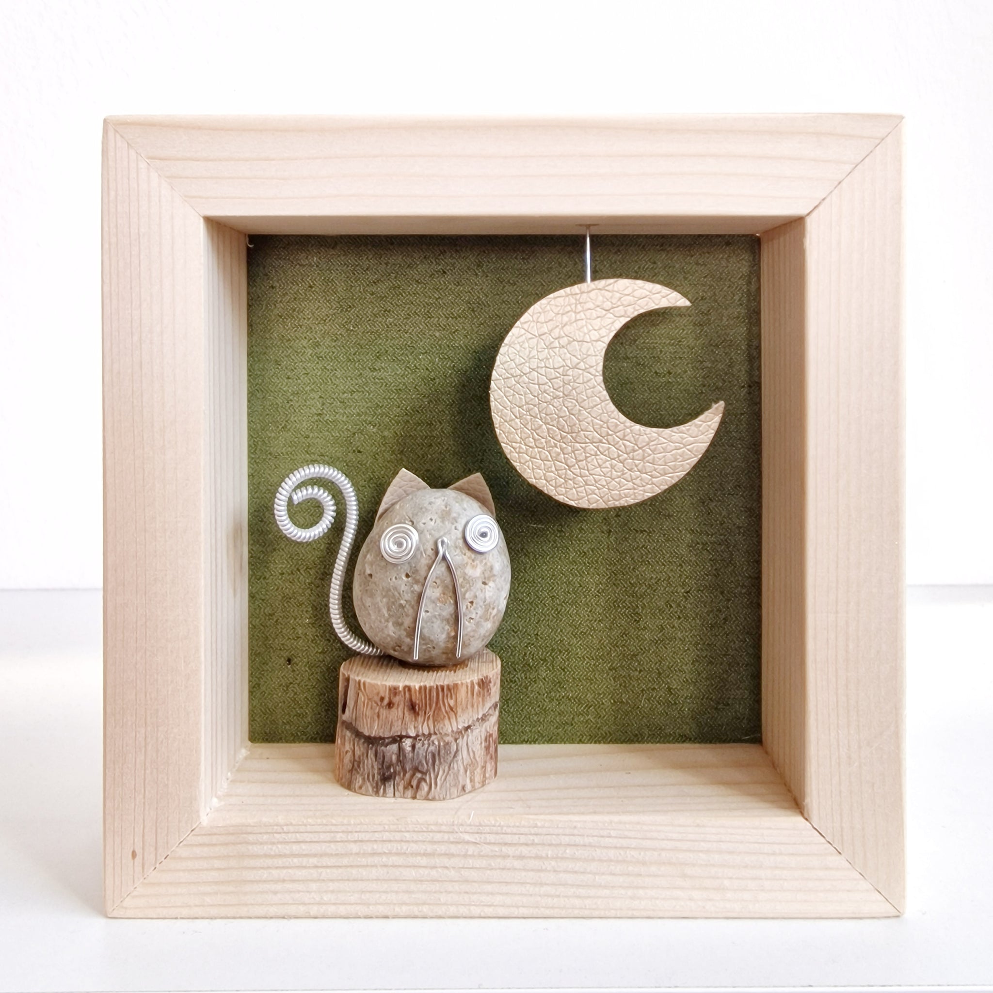 Il gatto è realizzato in pietra e filo d'alluminio. La luna è in ecopelle dorata e sospesa attraverso del filo metallico incastonato nella cornice, in modo da poterla muovere.
