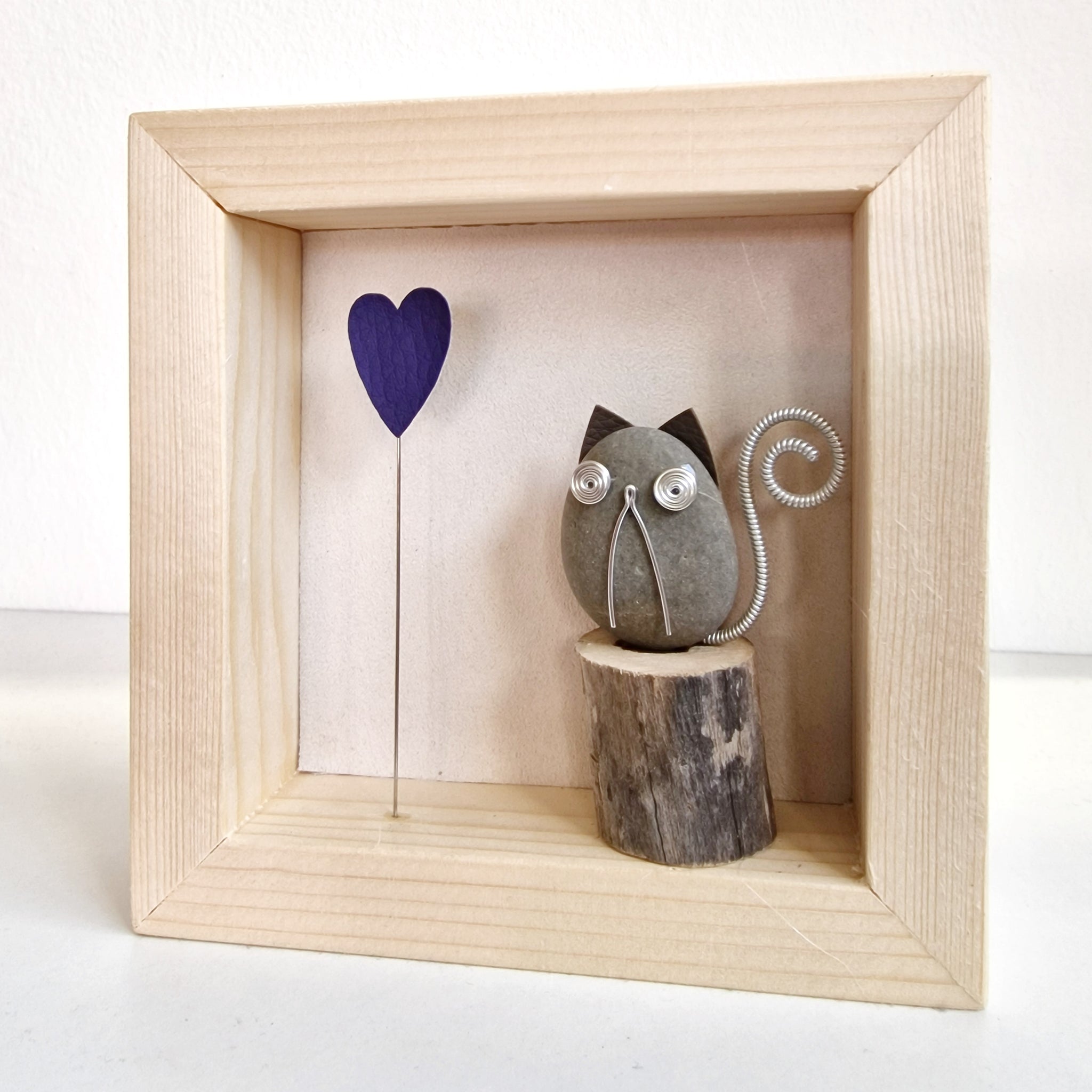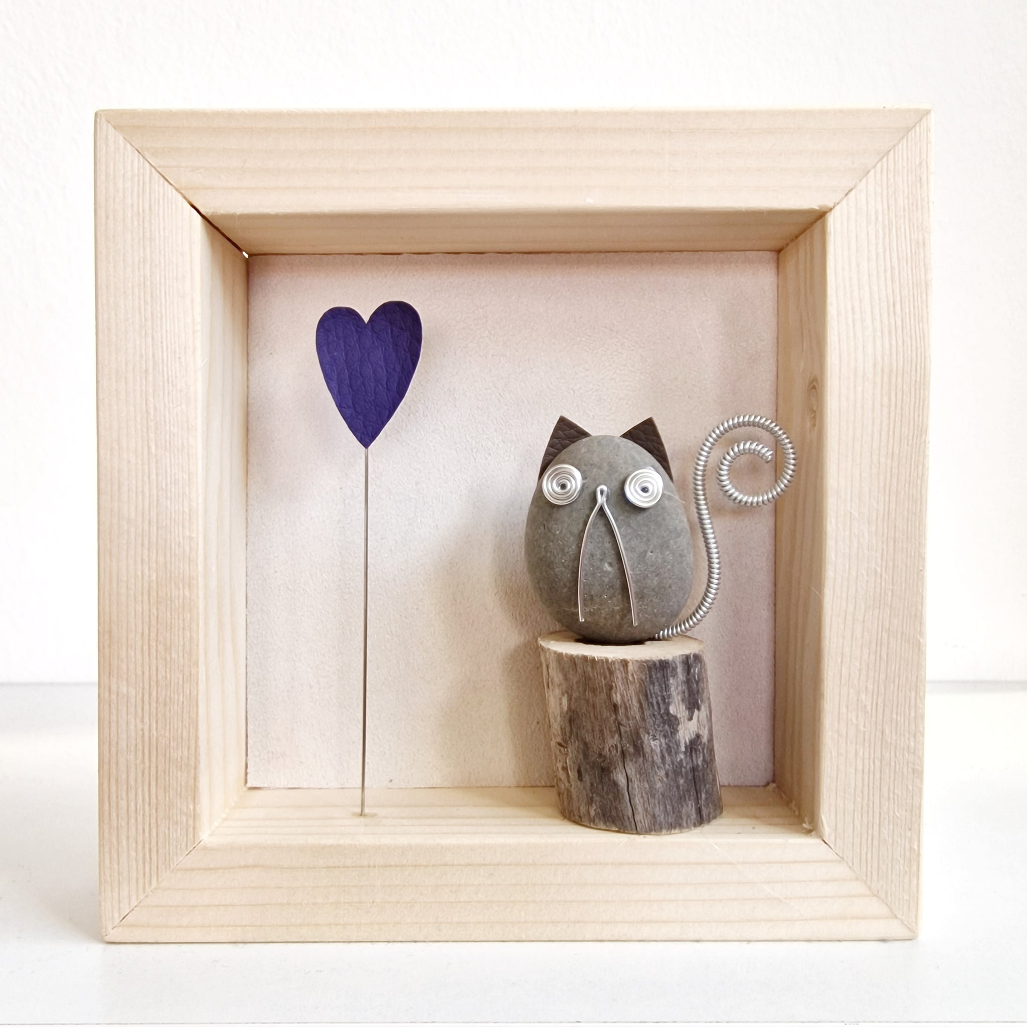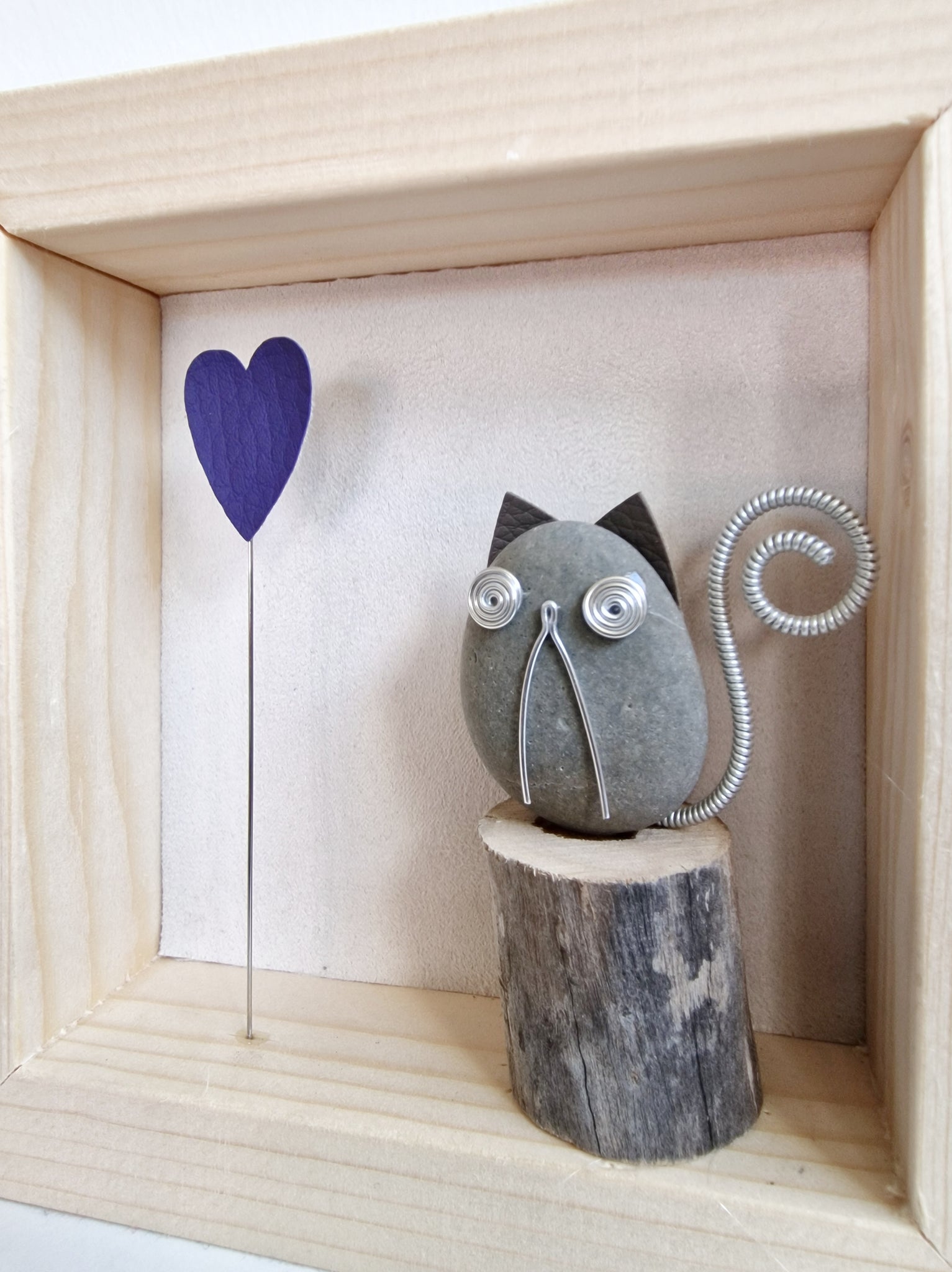 Il gatto è realizzato in pietra e filo d'alluminio. Il cuoricino è in ecopelle viola e sospeso attraverso del filo metallico incastonato nella cornice, in modo da poterlo muovere.