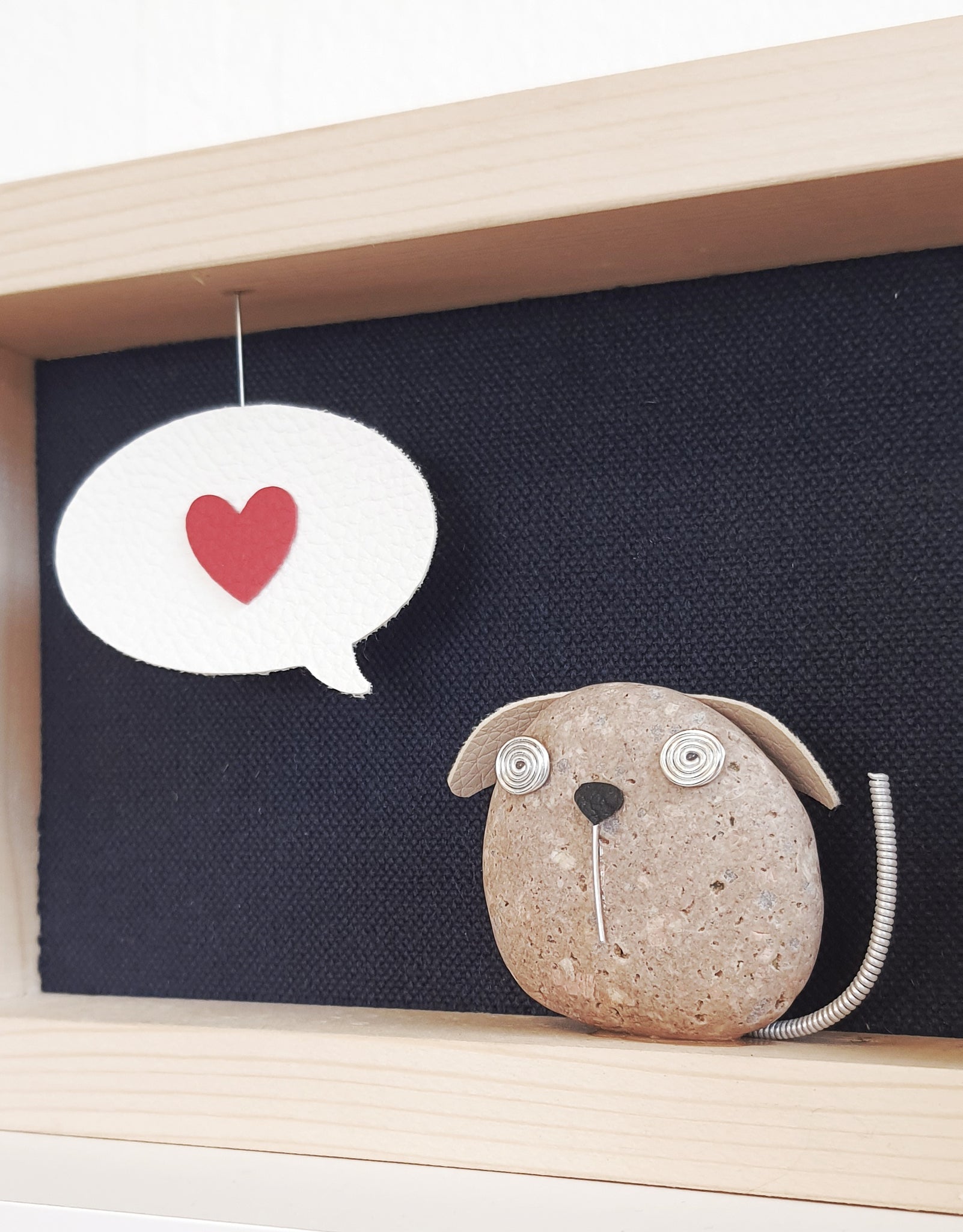 Il cagnolino è realizzato in pietra, filo di alluminio ed ecopelle.